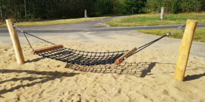 Hæng-ud stedet består af et trekantet topnet på 3x3x3 meter (lavet af 16 mm taifun med jernkerne), ophængt på stolper af robinia kernetræ.