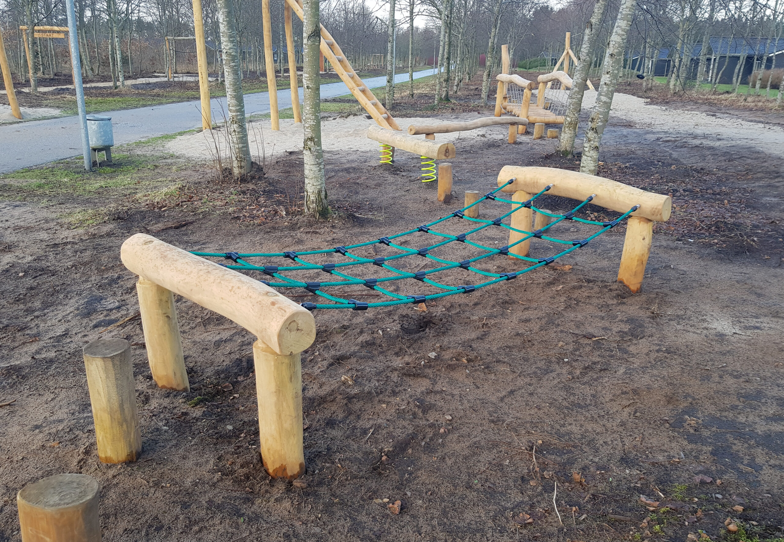 Stativ i robinia med net af taifun. Et legeredskab til udfordring af balancen for børn i alle aldre.